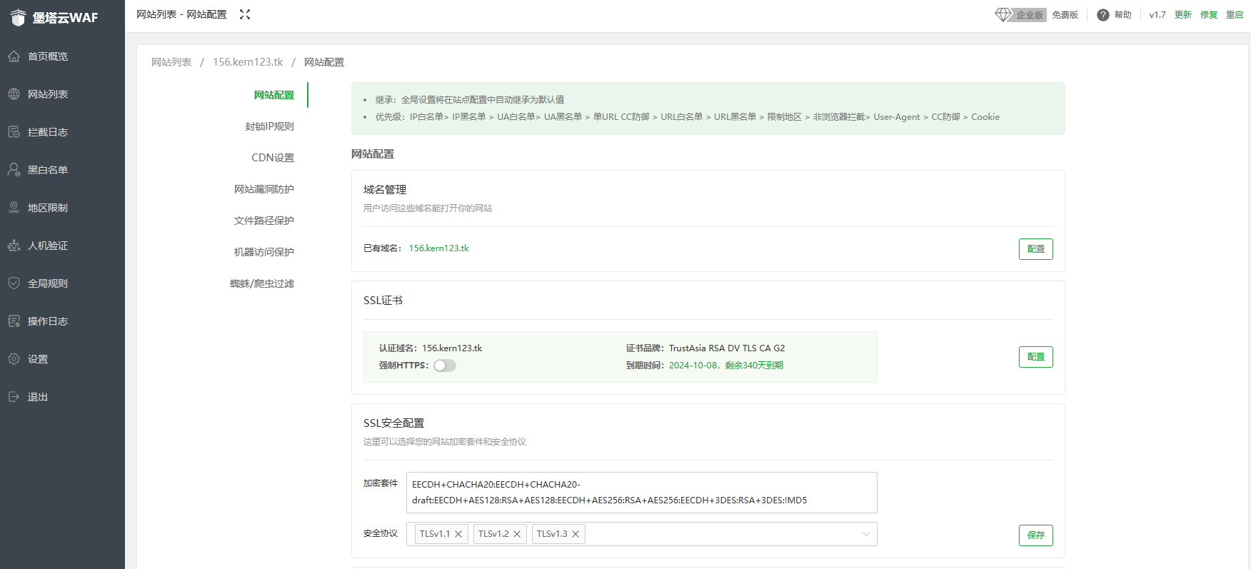 网站列表 --> **找到相关**网站域名 --> 网站配置