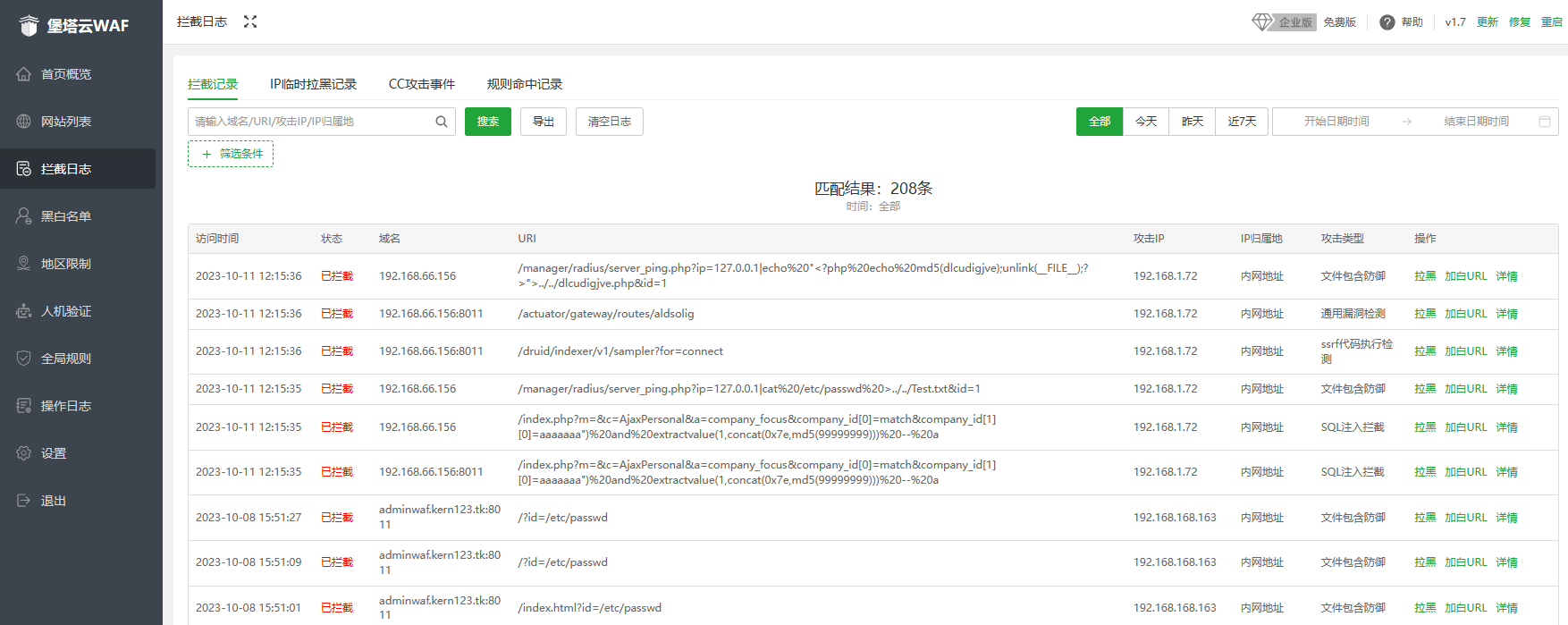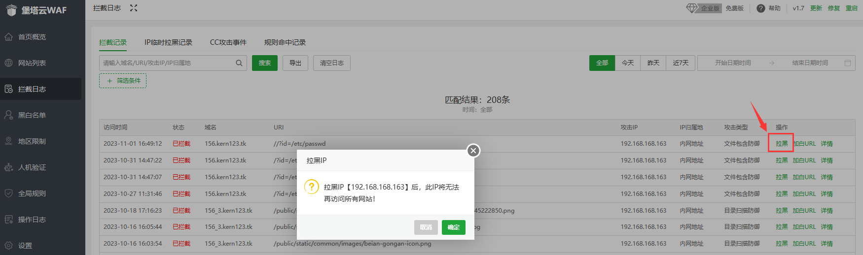 2.拦截日志 --> 拦截记录、IP临时拉黑记录 --> 加白URL