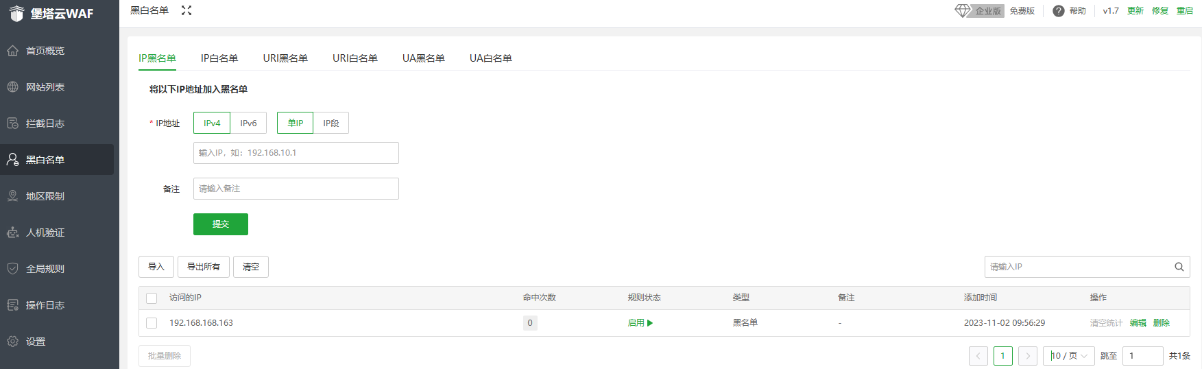## **添加、查看手动拉黑的IP可以在:黑白名单 --> IP黑名单**