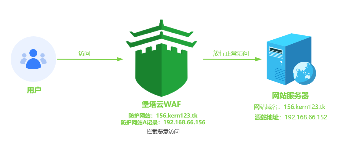 > 用户的访问经过堡塔云WAF过滤,再转发访问给网站服务器