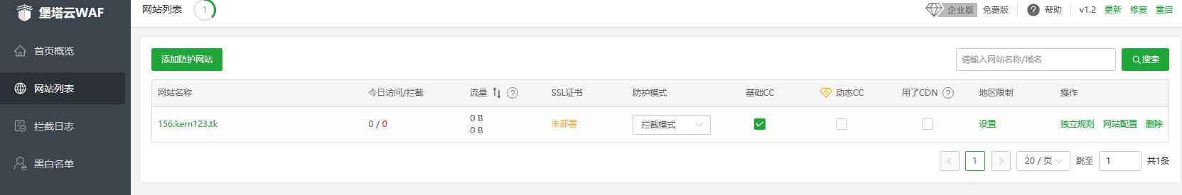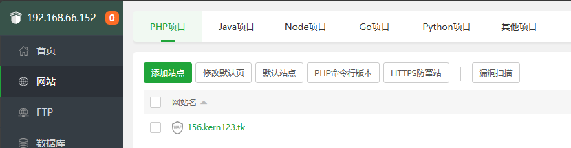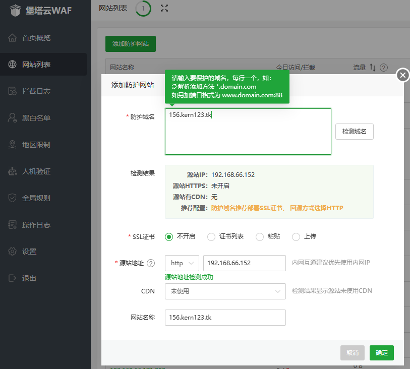 * 堡塔云WAF、防护网站A记录IP:192.168.66.156