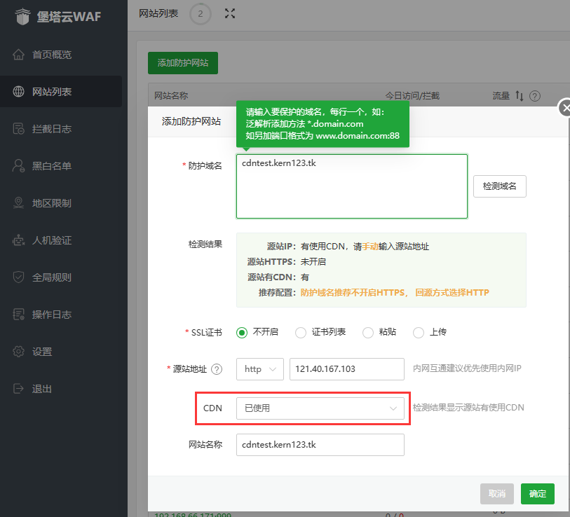 * 请选择已使用,否则可能会拦截CDN的访问IP,导致用户无法正常访问