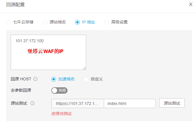 ### **修改CDN的回源配置IP地址为 堡塔云WAF服务器的IP,请到CDN提供商处修改回源配置**