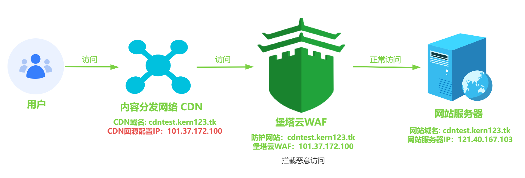 > 用户访问CDN,CDN将转发访问给堡塔云WAF过滤,再将转发访问给网站服务器