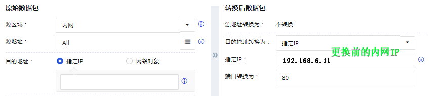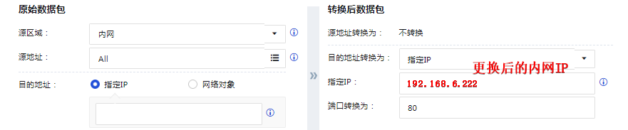 需要将硬件防火墙的端口映射 网站服务器的内网IP:**`192.168.6.11`** 更换为 云WAF服务器的内网IP :**`192.168.6.222`**