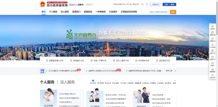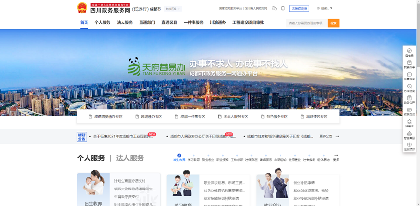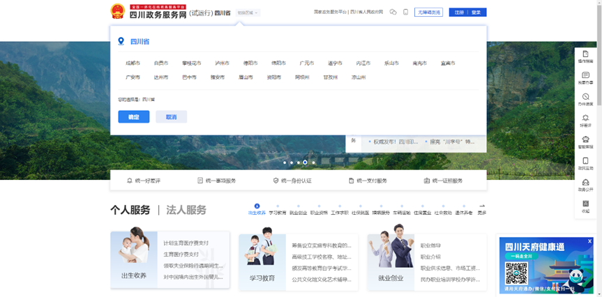 2、通过网页顶端的“切换区域”,选“成都市”,点击“确认”,将区域切换至成都市,进入成都市办事页面