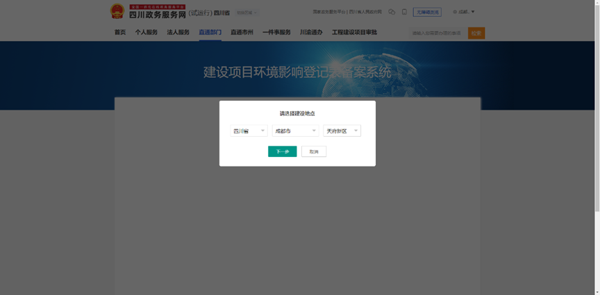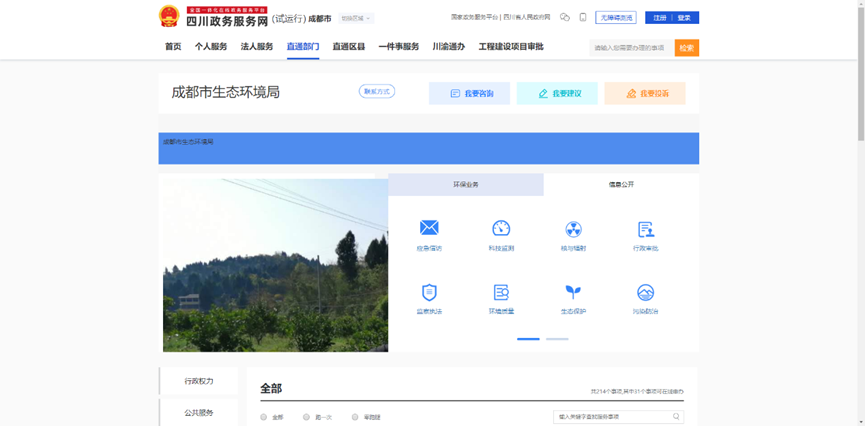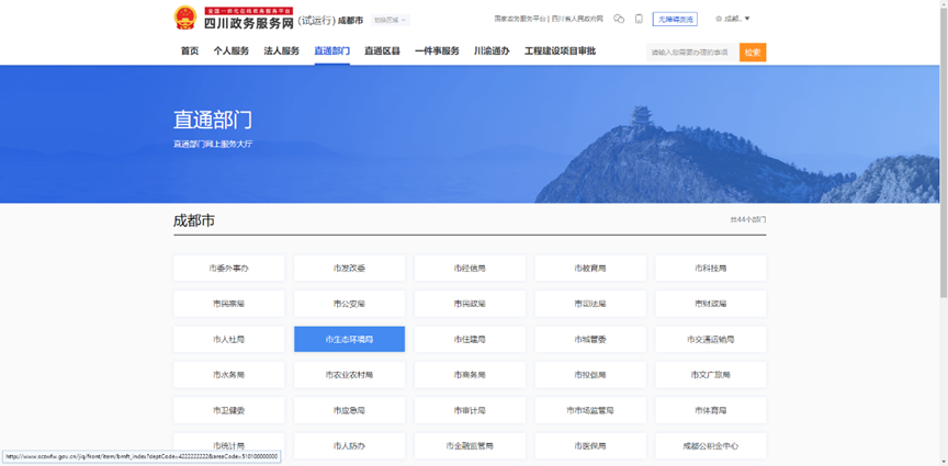 4.点击“直通部门”,选择“市生态环境局”,进入成都市生态环境局办事页面