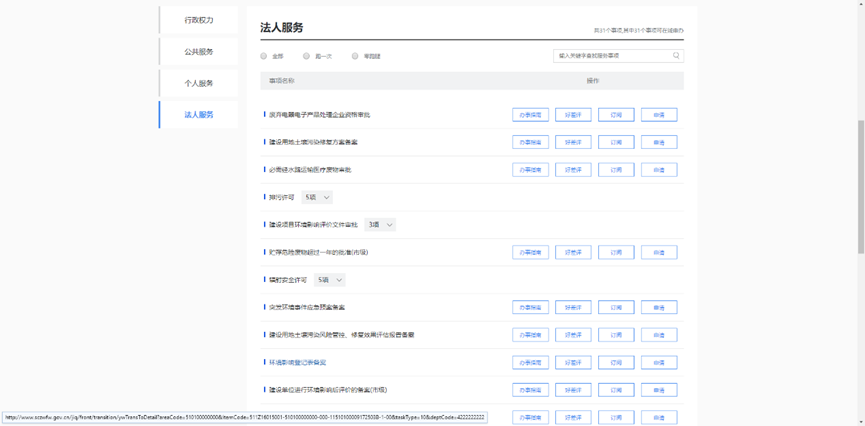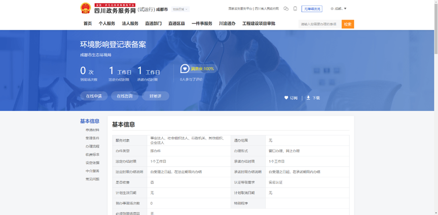 5.点击“法人服务”,选择“环境影响登记表备案”,进入“办事指南”,点击“在线申请”,进入备案登记。
