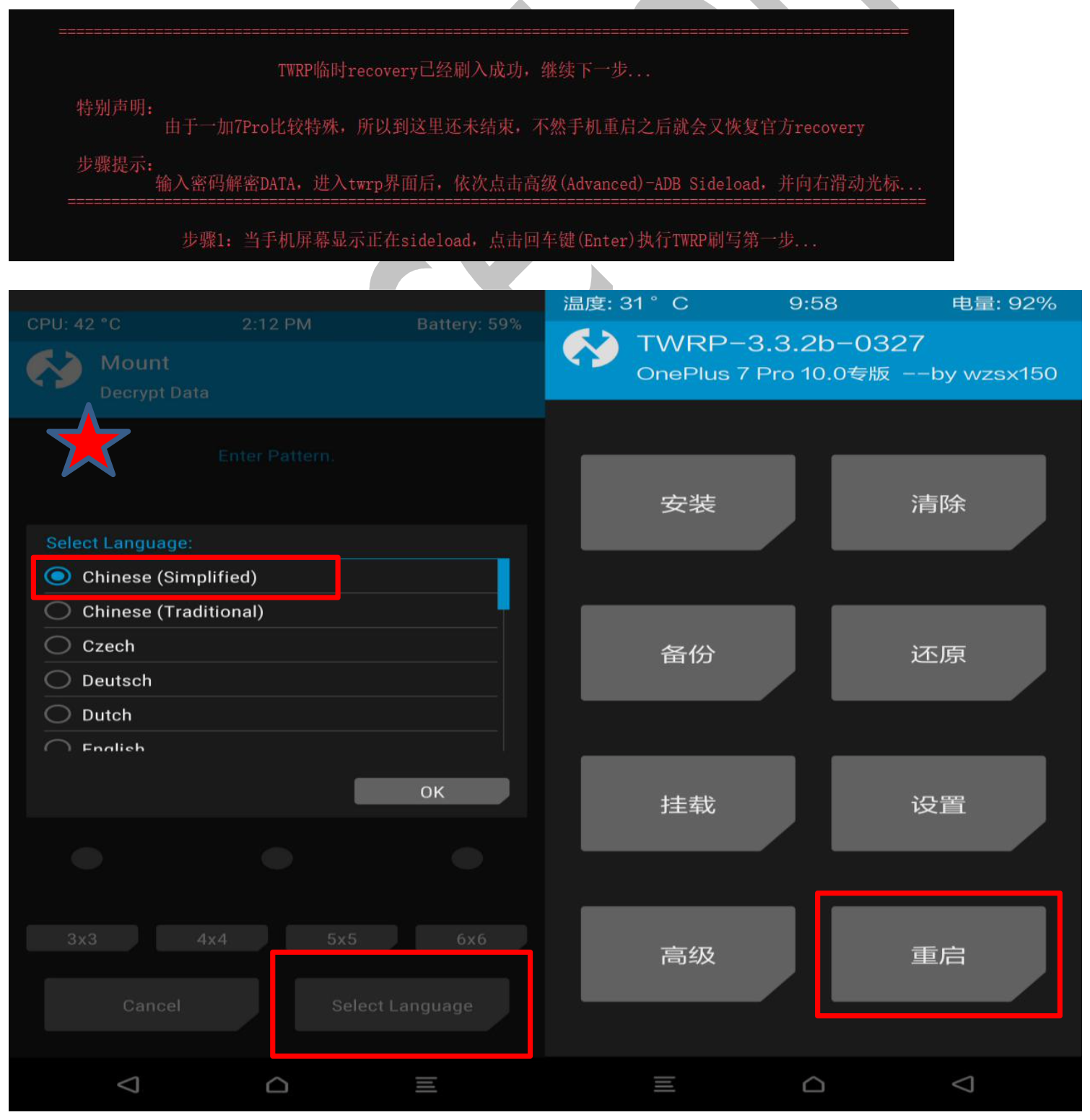 > 刷入完成 手机即会重启到 **recovery** 界面 即以下界面 则以成功刷入。首先点击 Select language选择语言 Chinese(Simplified)意思为简体中文如你需 要繁体中文 即点击下一选项 然后 右滑 进入 TWRP 主界面 完成此步骤