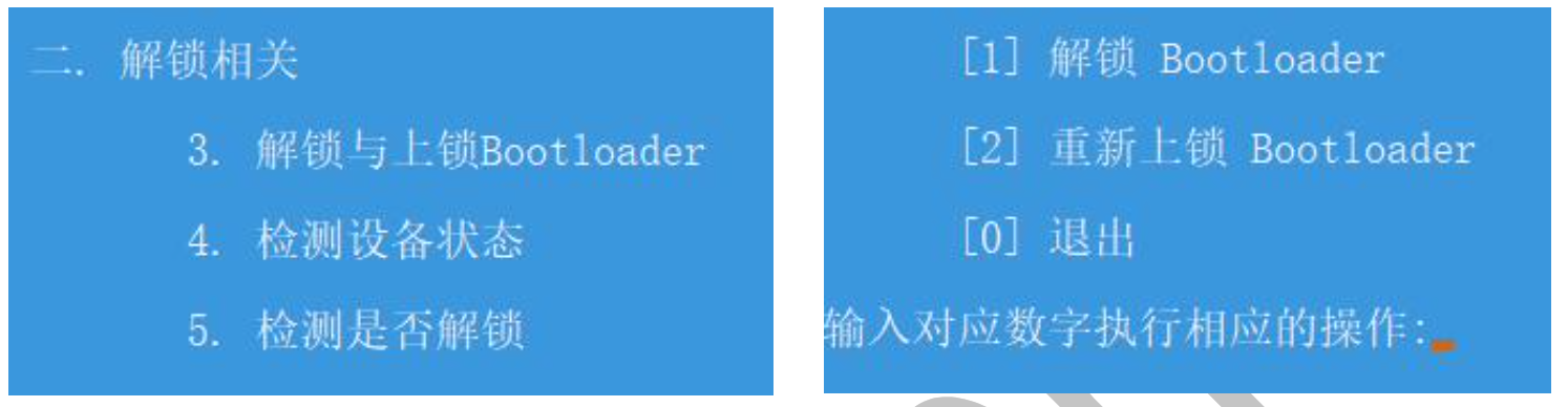 > **手机会出现一个英文界面音量键选取第二个选项(unlock 开头) !! 并电源键确认 unlock**
