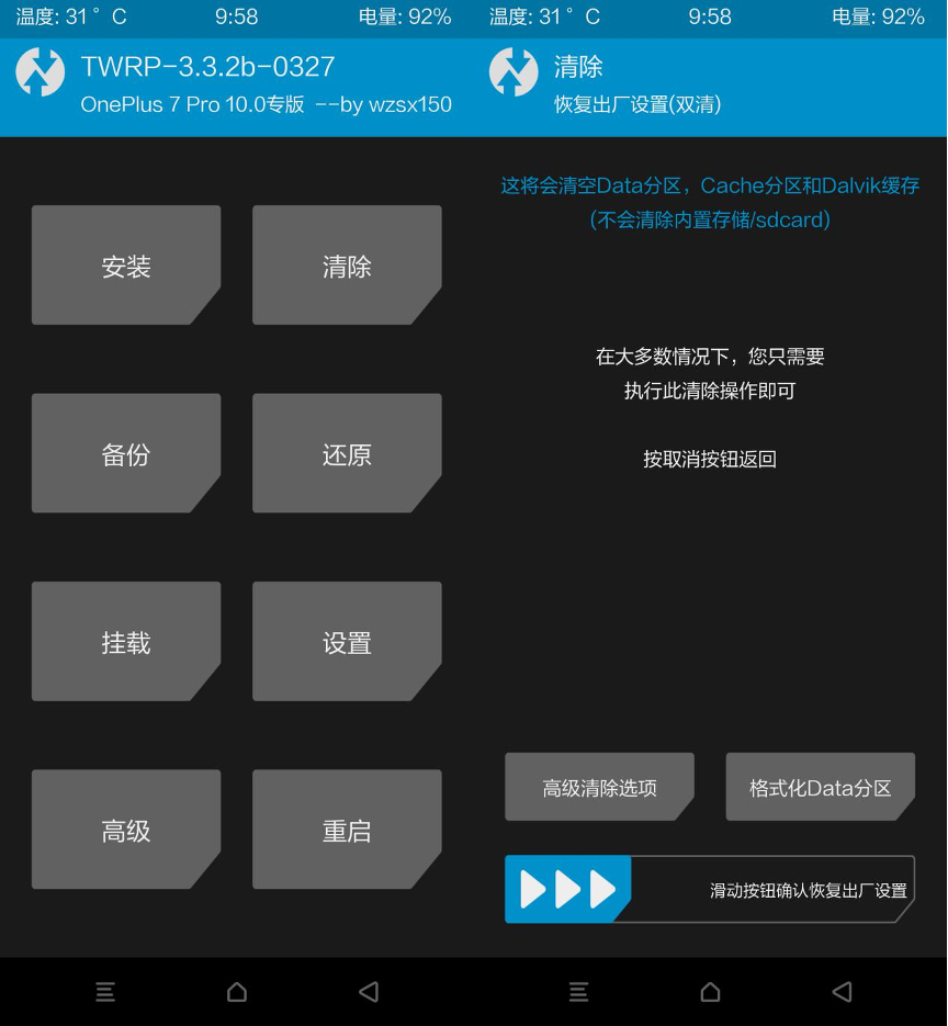 > 手机关机 长按电源键和音量下键 进入 TWRP 下面演示如何操作 首先点击清除 然后 **右滑** 进行双清 进行下一步刷包
