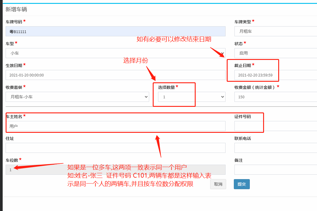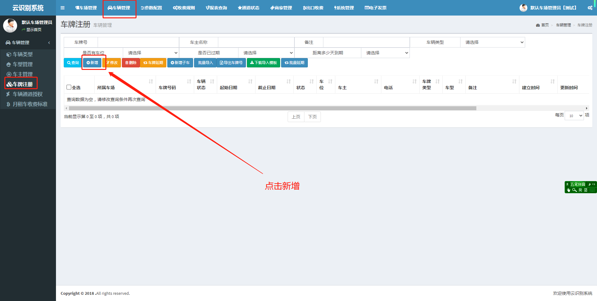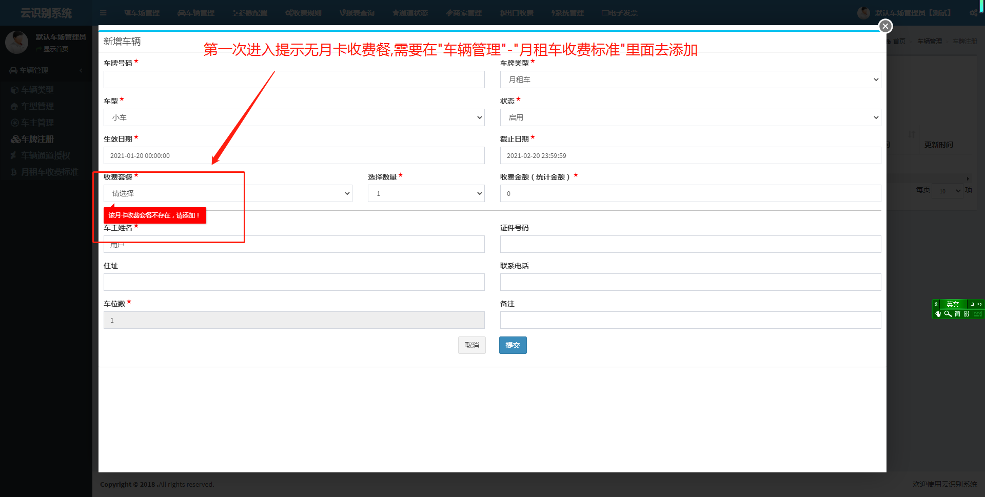 第一次新增车牌,会出现如下图提示,是因为新系统还没有添加月租车的收费标准,所以不能新增车牌