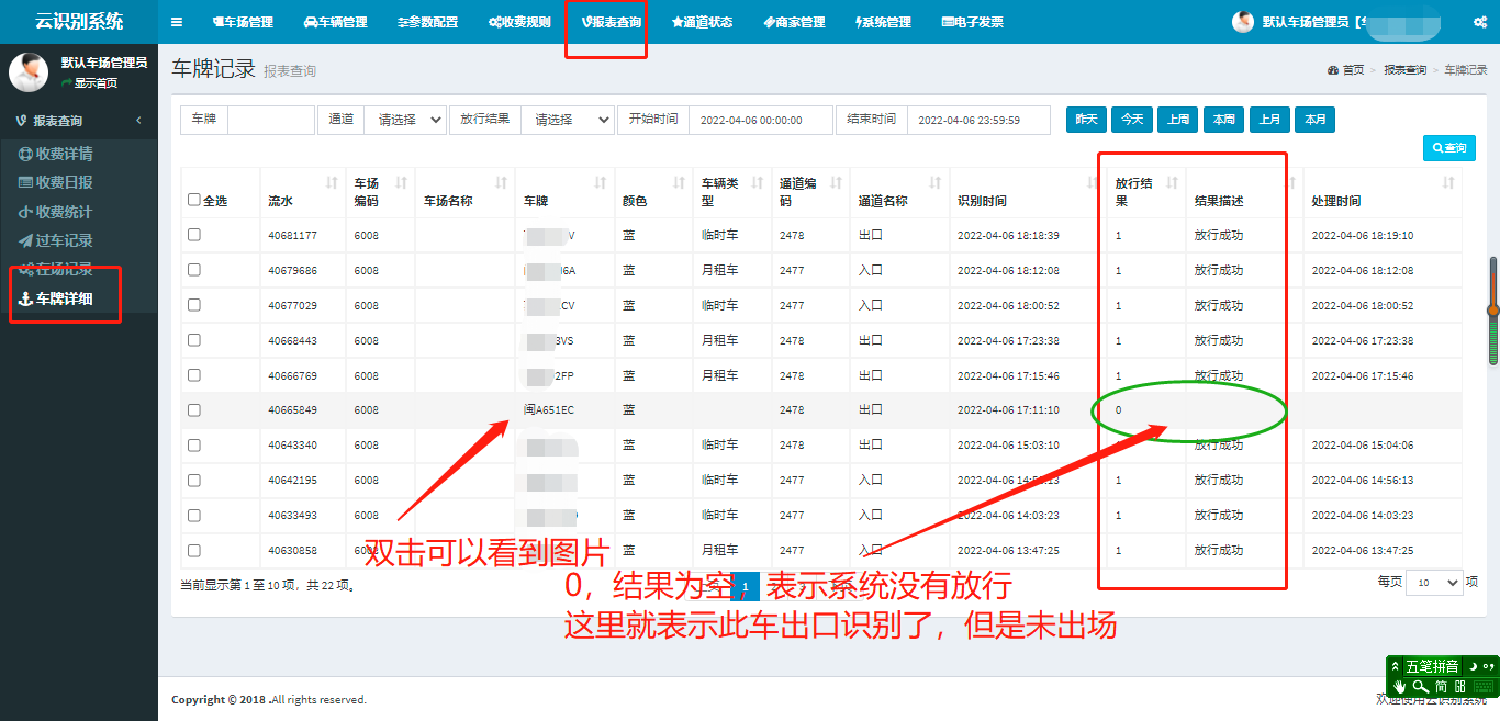 如下图,所有被相机识别到的车牌,都会记录下来,如后面的结果正常,表示系统已放行,如果是未授权或者为空表示系统未放行。也可以双击查看图片
