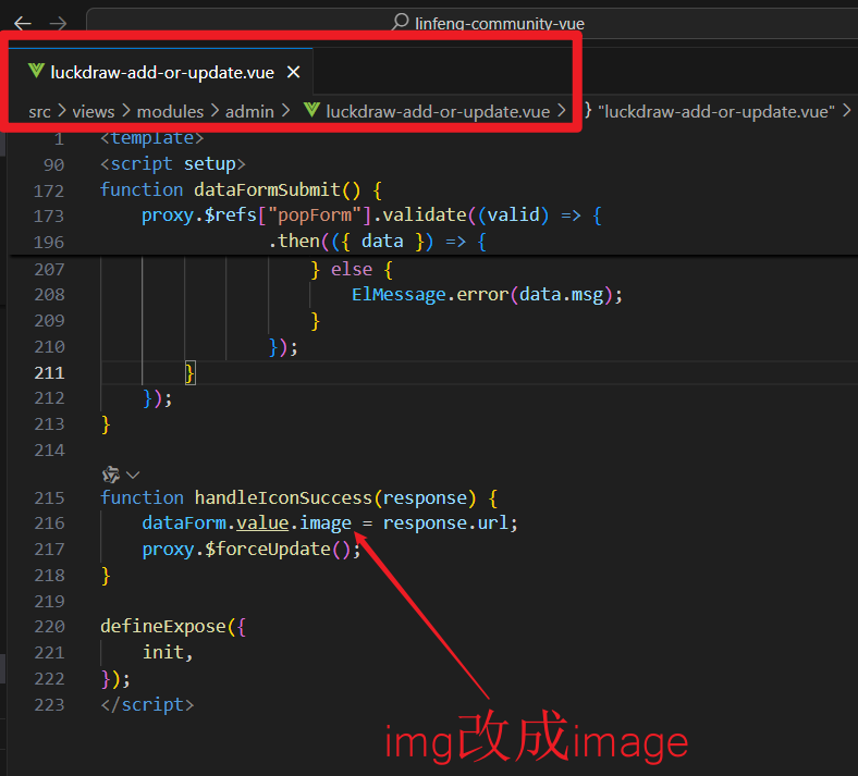 答:这是V1.16.0及之前部分版本中没有及时更新的小问题。请按照如下图方式将linfeng-community-vue\src\views\modules\admin\luckdraw-add-or-update.vue第216行的img修改成image即可