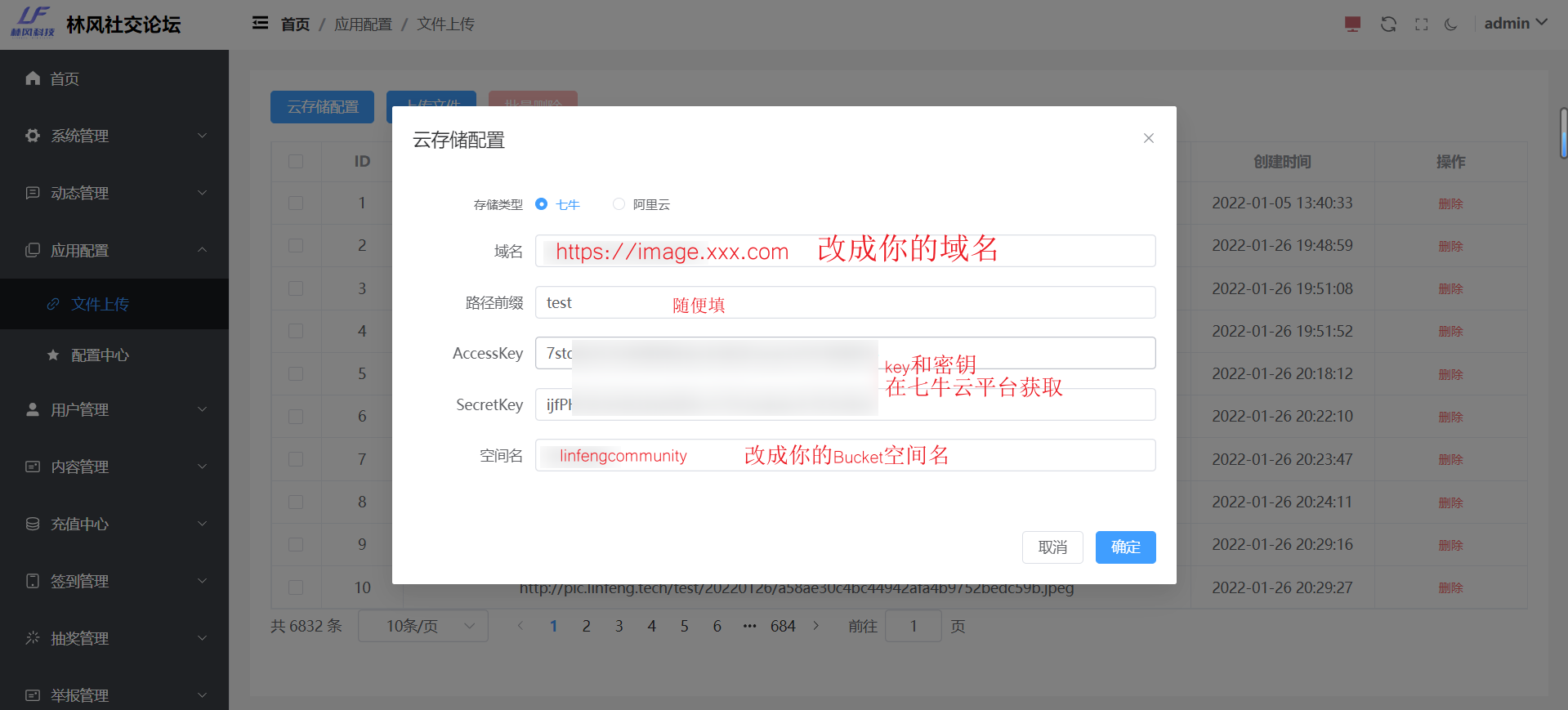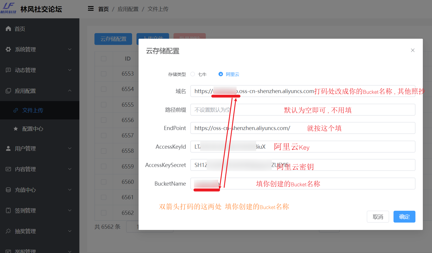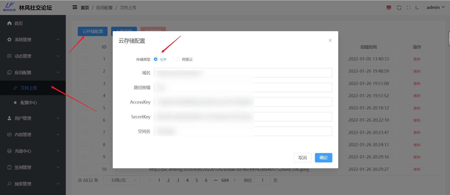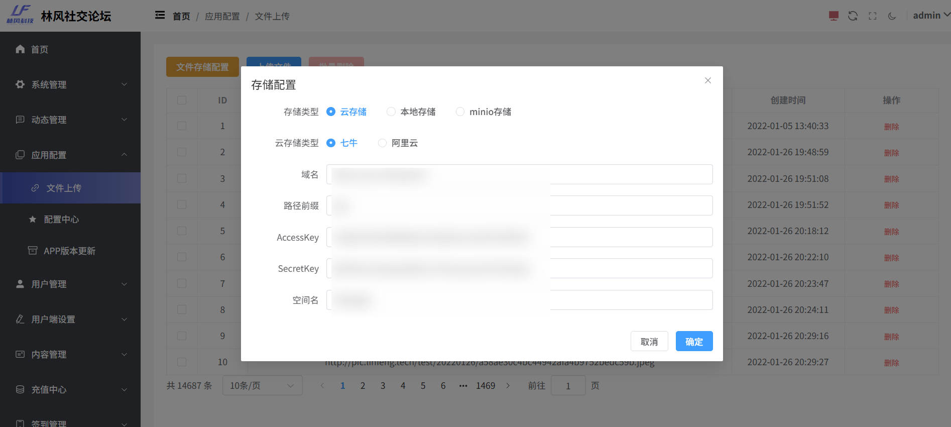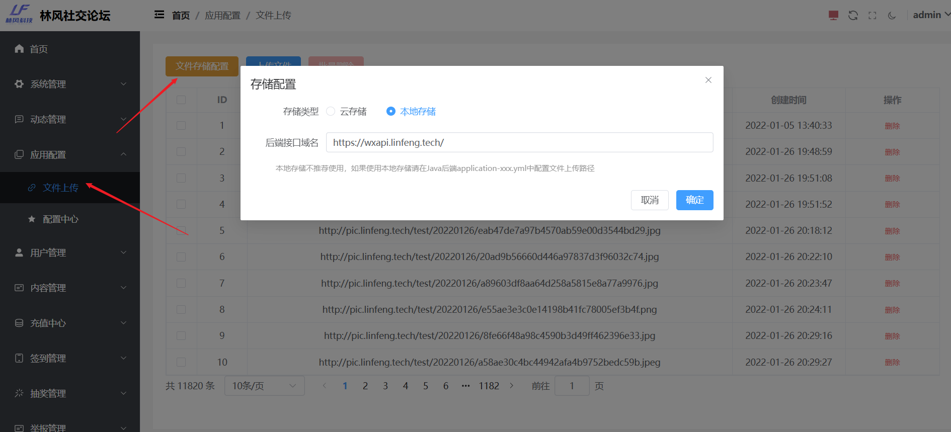 文件存储配置在`后台管理系统`——>`应用配置`——>`文件上传`——>`文件存储配置`。