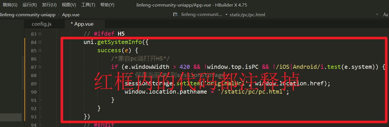 答:搜索“/static/pc/pc.html”,注释红框内的代码即可。注意:如果部署时更换了H5端的路由,直接用浏览器访问H5端(没在手机模式下),会导致访问异常,因为项目重定向到了/static/pc/pc.html,只要把它注释了即可。