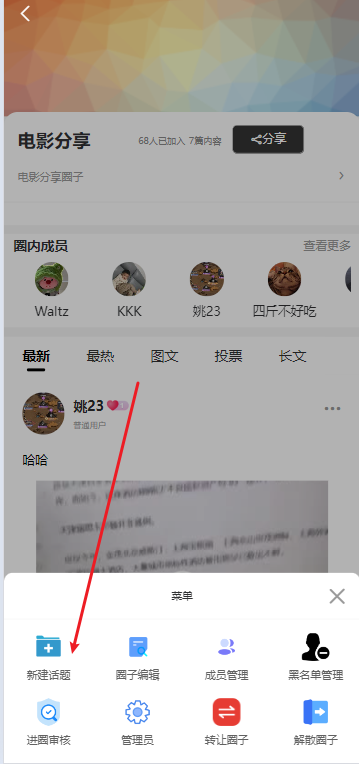 话题由圈子管理员或圈主在用户端的圈子详情页的菜单中的新建话题入口创建。