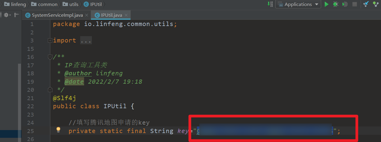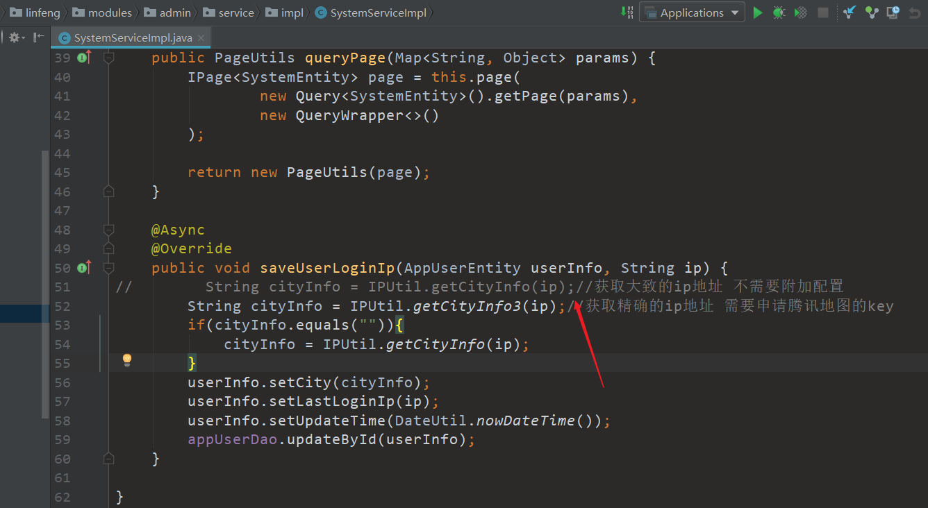 答:项目中使用的IP属地定位功能默认是免费版本的(一般来说足够用了)。如果你想用腾讯IP精准定位,那么如下图所示进行设置(注释51行,打开52-55行)。然后你需要去腾讯地图申请key。申请地址:https://lbs.qq.com/dev/console/application/mine