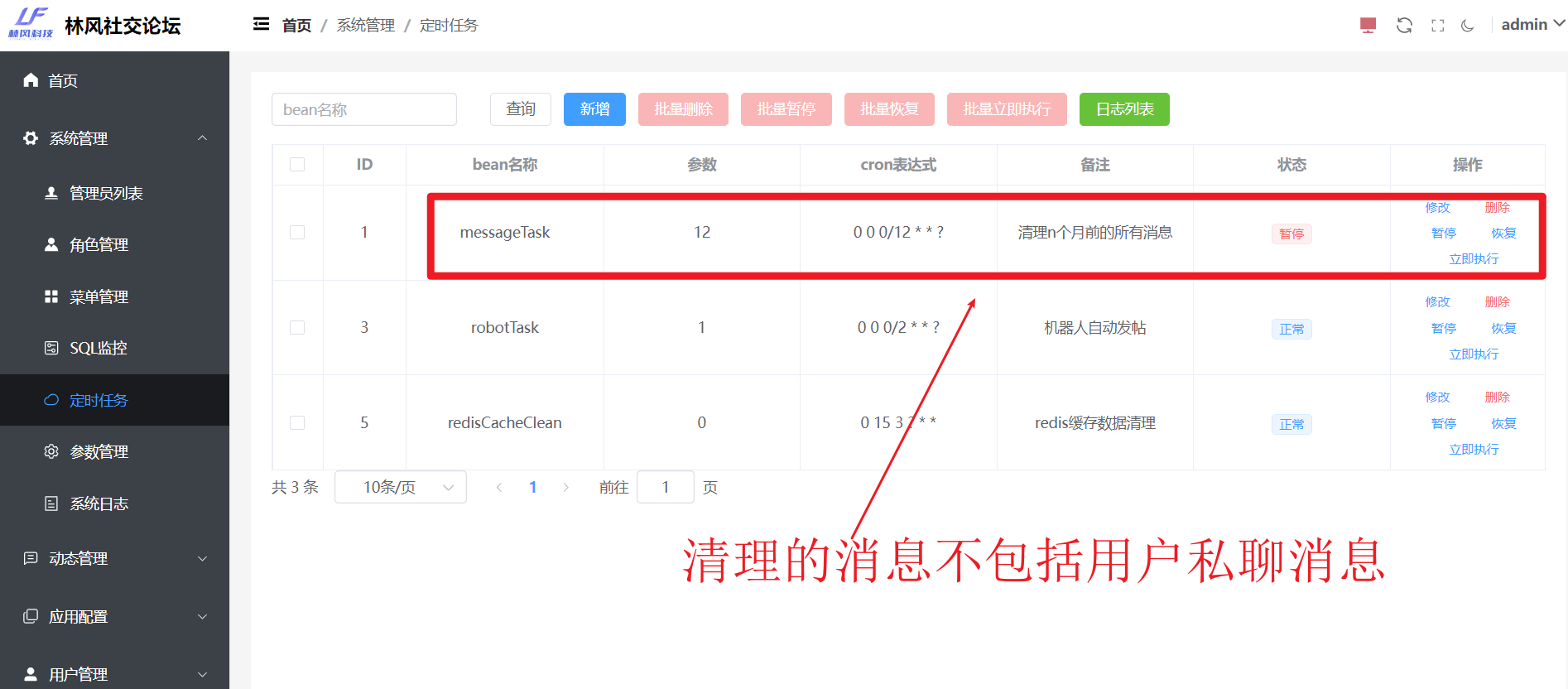 答:消息定期清理任务如图所示,可以自行定义清理多久前的数据,需要的话可以开启。如果消息要留存就定期备份数据库。注意:清理的消息不包括用户私聊的数据。