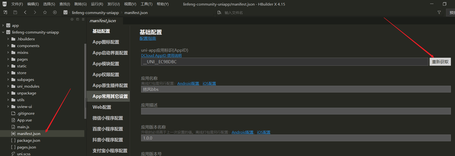 ### 48.第一次使用uniapp项目,提示appid不存在,请在mainfest.json中重新获取。