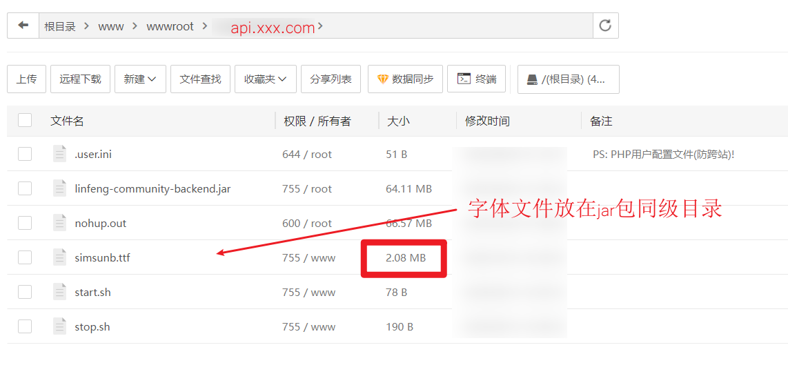 答:需要把字体文件simsunb.ttf文件(这个文件在后端linfeng-community-backend文件夹里,与pom.xml在同一级目录)上传至服务器上的jar包同级目录下。如下图: