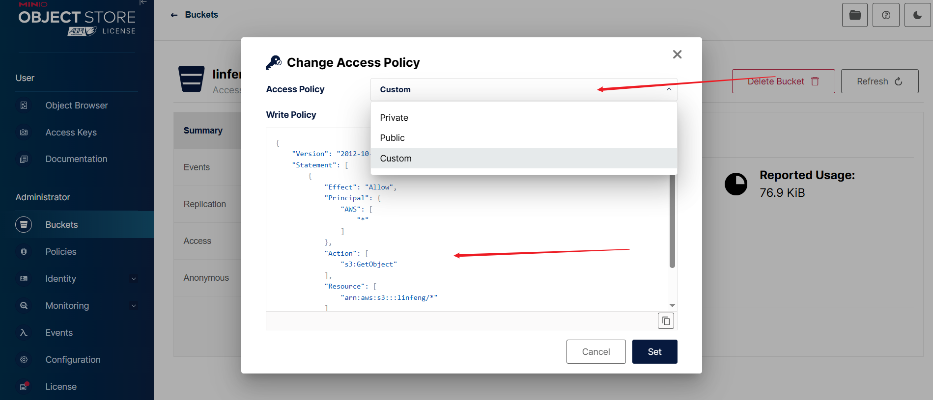 注意要手动设置存储桶为公开访问(不推荐)或者自定义访问策略(推荐):登录 MinIO Console,在控制台中创建bucket,名称为:linfeng。
