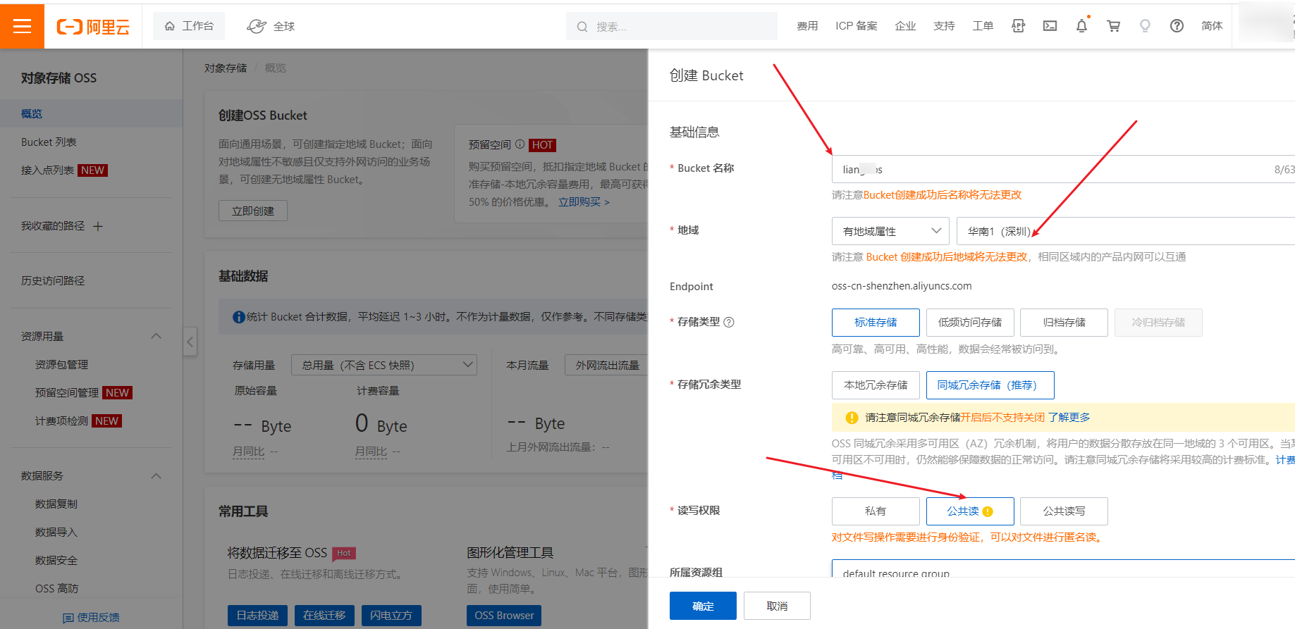 * 选择public公开访问(不推荐公开)。或者选择custom自定义策略(推荐),并添加以下策略内容: