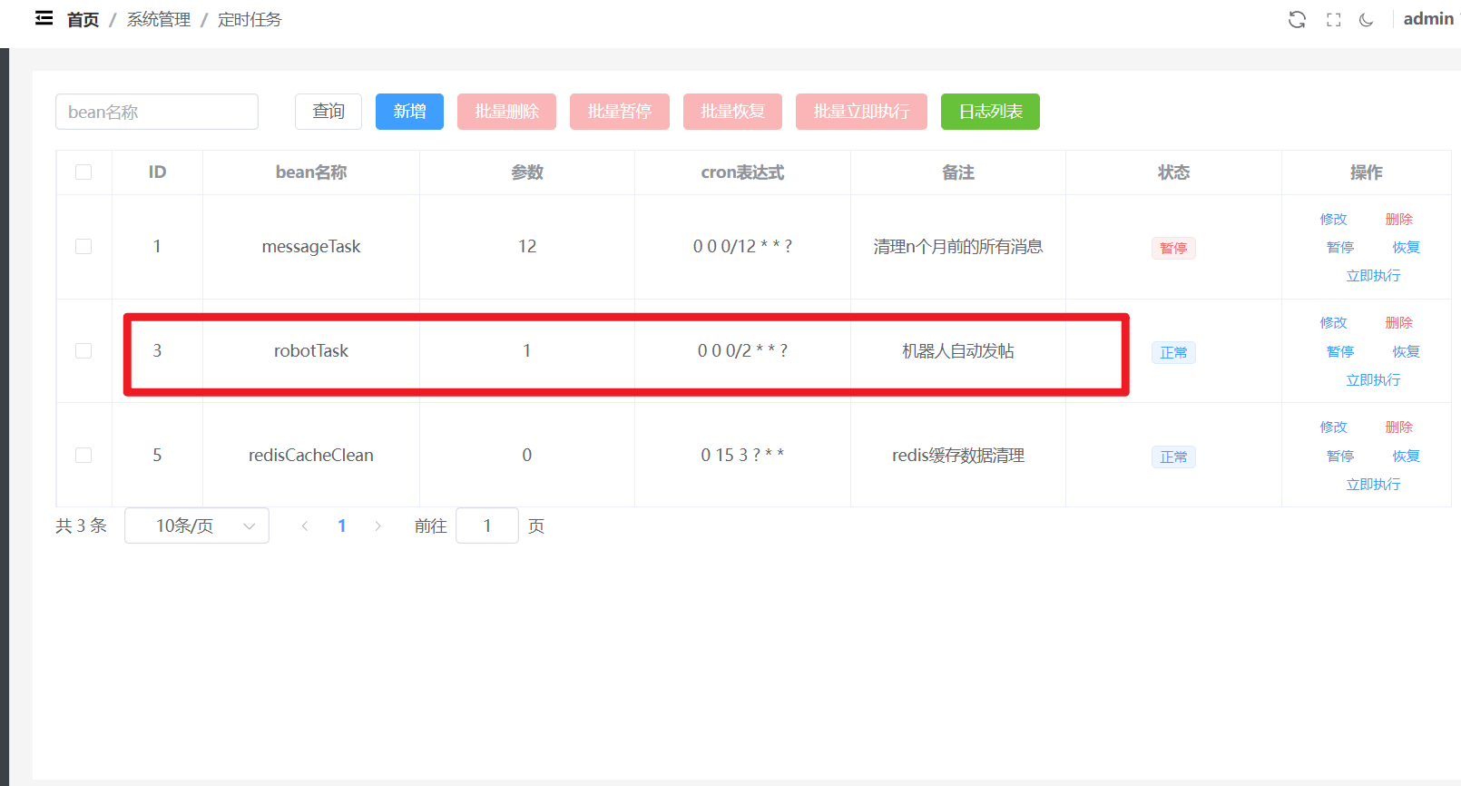 答:在定时任务列表,可以自定义执行时间。不要的话暂停此任务即可,需要立即执行的话点击“立即执行”。不会写cron表达式的话可以用:https://cron.qqe2.com/ 在线生成器。发布的帖子内容来自开放接口。