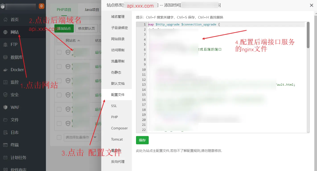 关于后端api服务域名`api.xxx.com`的nignx配置在如下图所示的地方进行。