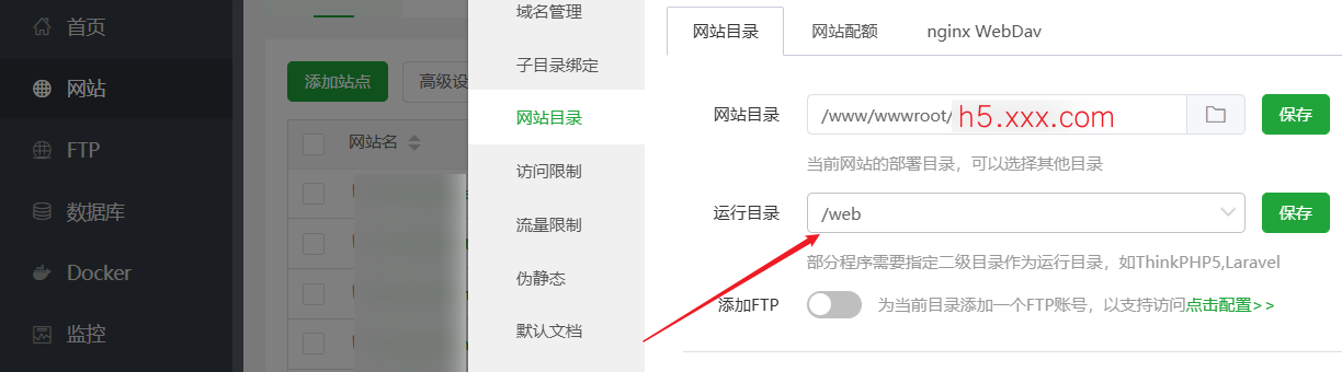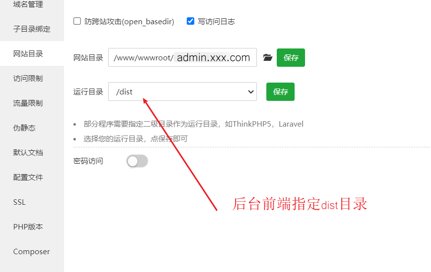 对于`admin.xxx.com`和`h5.xxx.com`,不用手动修改nginx配置文件,你只需要按如下图指定目录即可(宝塔会自动修改nginx文件配置)。