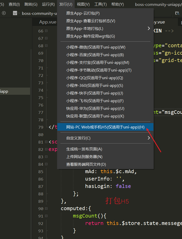 接下来,进行H5端打包操作。如下图,选择**发行**
