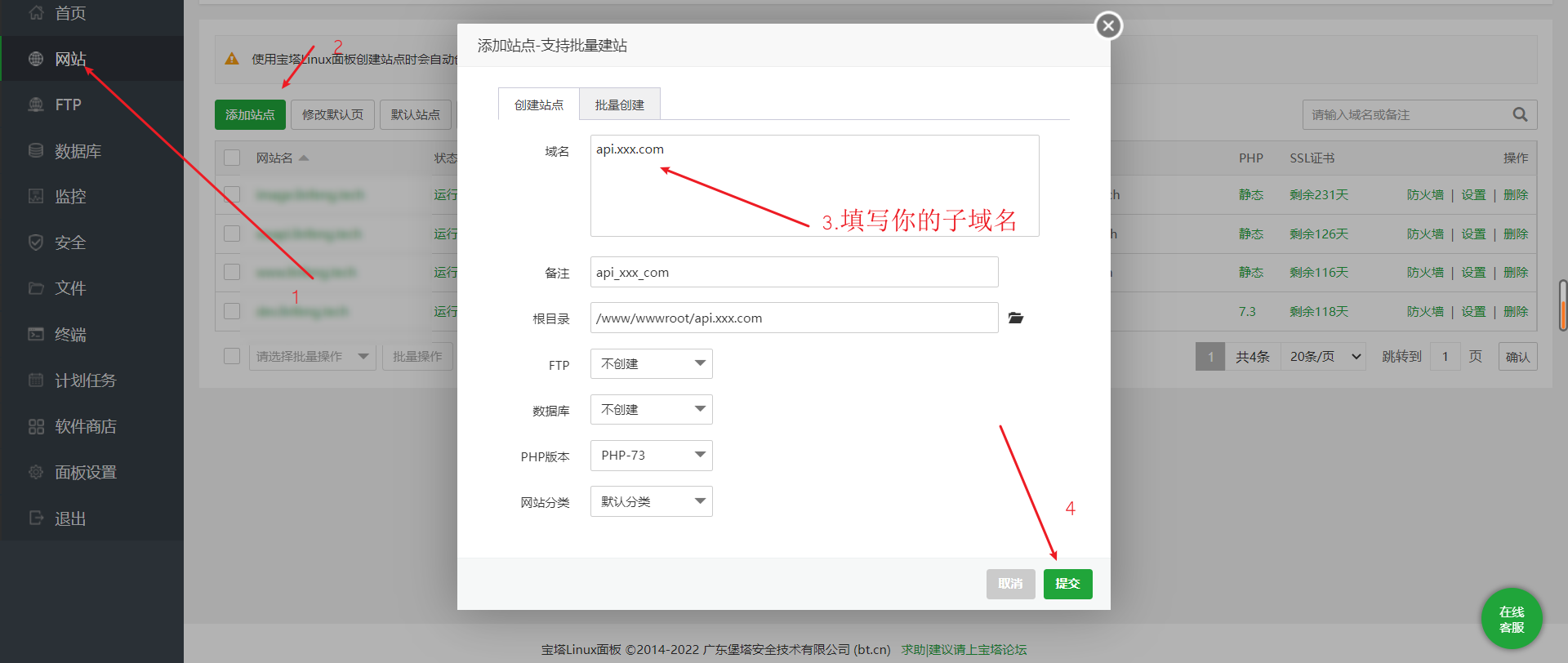 接下来,`添加站点`操作如上图所示。重复步骤,分别创建`api.xxx.com`站点,`admin.xxx.com`站点,`h5.xxx.com`站点(需要h5端的话需要创建)。