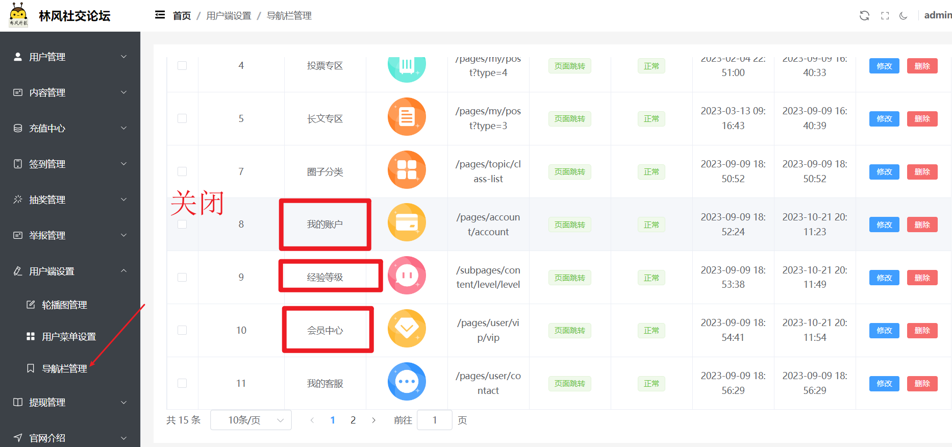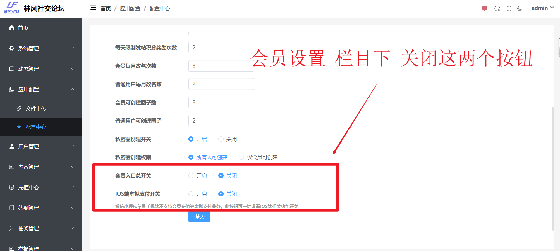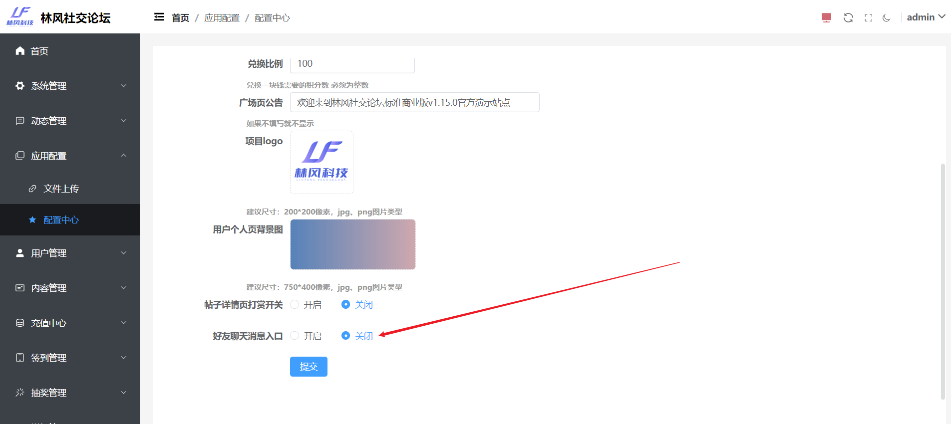 另外,如下图所示,V1.15.0版本新增了好友聊天模块的总开关,支持后台开启或关闭该模块。该按钮关闭后,消息页面,不再展示好友栏和私聊入口,用户主页也不再展示加好友的入口。审核的话也可以关闭了。