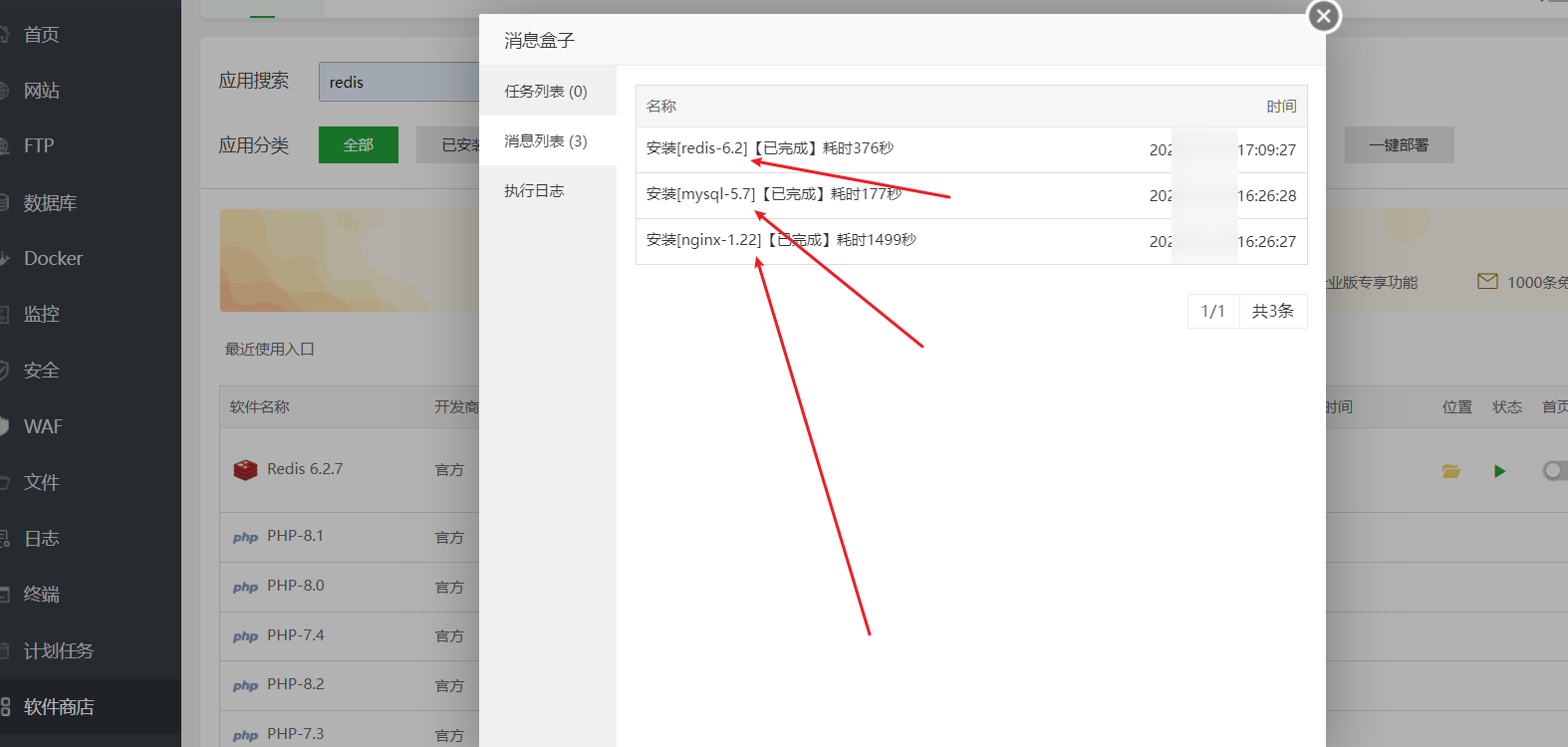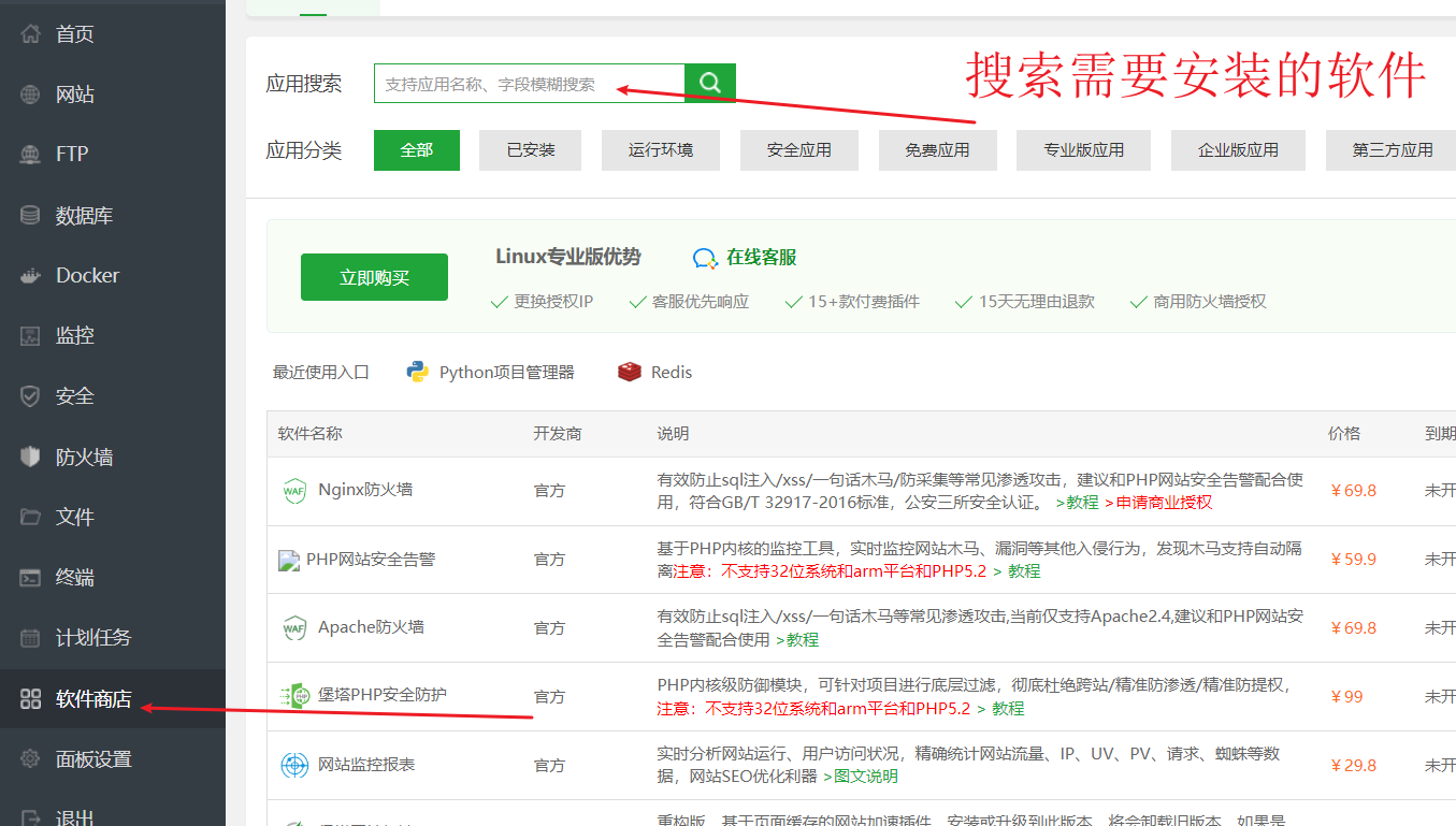 按照宝塔安装手册要求(https://www.bt.cn/bbs/thread-19376-1-1.html) 安装好宝塔面板以后,然后需要在宝塔上一键安装如下软件:`Nginx`,`Redis`,`MySQL5.7`。