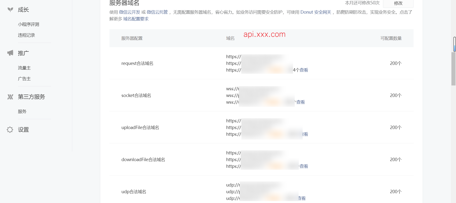 如上图,你的后端域名 api.xxx.com,在这5个打码的地方都填上。