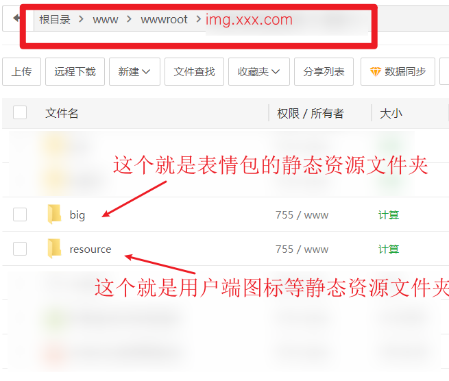 如何改成你的地址:比如放在服务器本地,那就在宝塔上创建一个新的站点,例如叫做`img.xxx.com`,然后配置好你的ssl证书和DNS解析,再把我们提供的压缩包里的静态资源resource文件夹,以及表情包的big文件夹,放在同级目录下(www/wwwroot/img.xxx.com),放过来之后可以访问到具体图片资源即可,如下图所示。