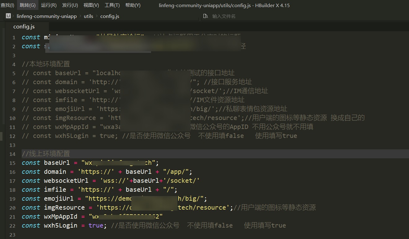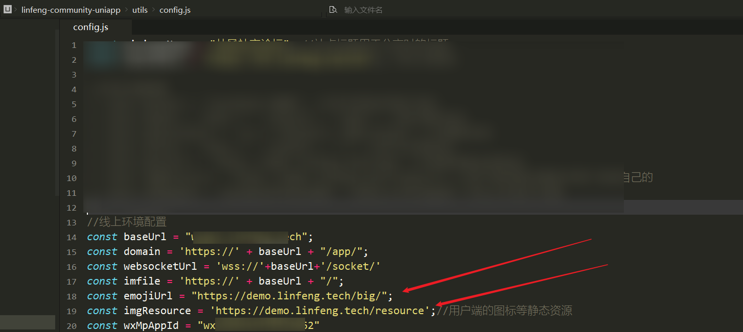 如下图所示,请记得在uniapp项目的utils/config.js中配置你的`imgResource地址`和`emojiUrl地址`,应用上线前必须改成自己的,千万别用官方的!!!