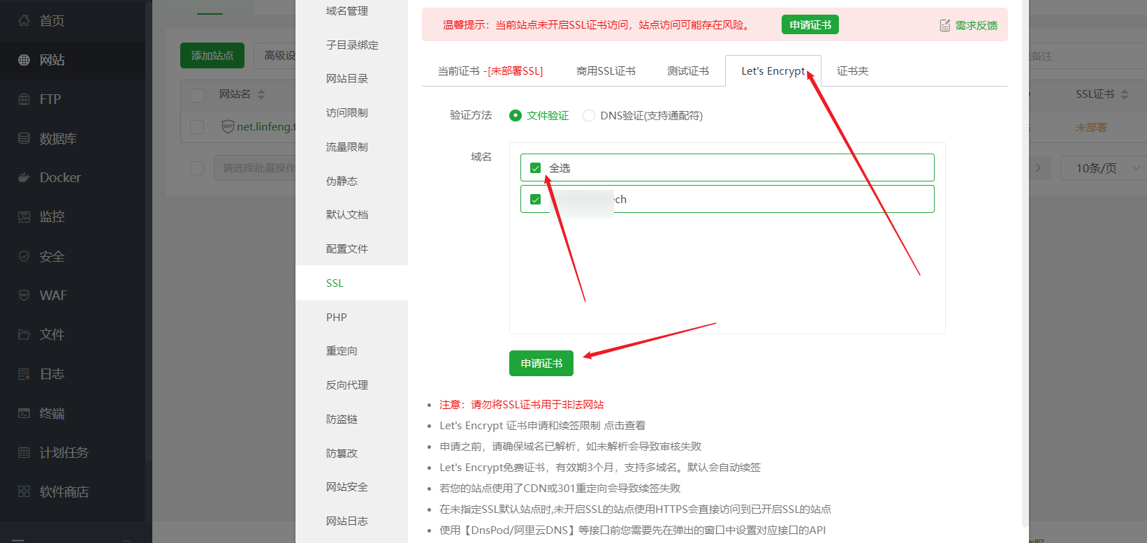 注意:你这里申请的前提是DNS已经解析了对应的子域名,不然申请会失败的哦。