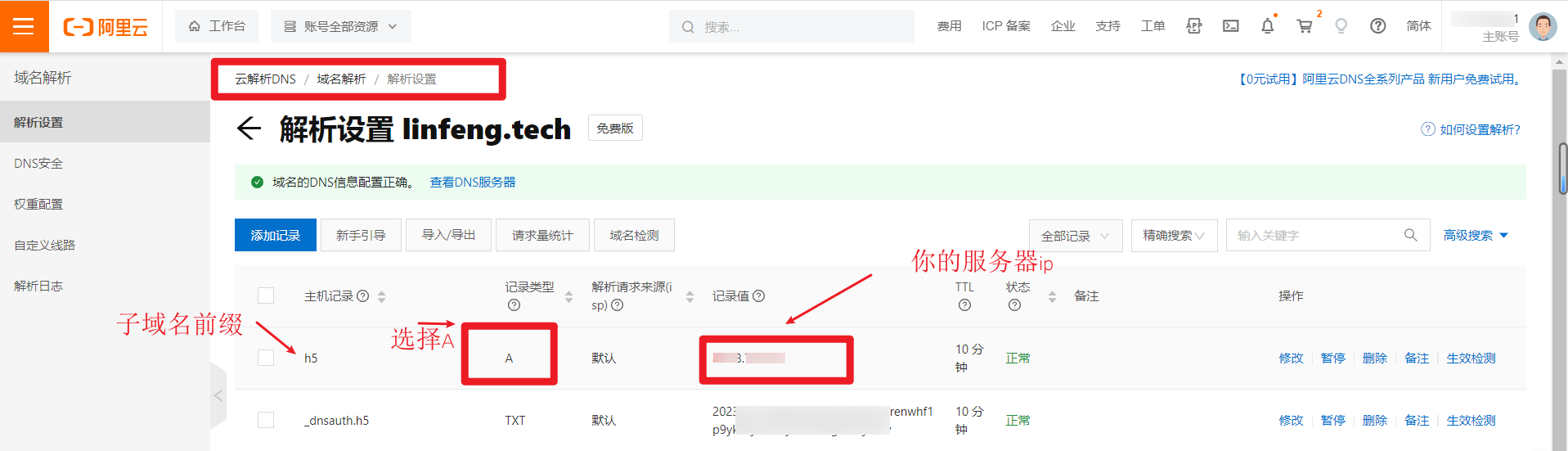把域名和IP做对应解析(凡是你用到的子域名都要做DNS域名解析,在你购买域名的对应的阿里云或腾讯云或其他云服务商的后台管理端找到DNS解析模块去处理)。示例如下图(这里以配置`h5.xxx.com`的DNS解析为例子):