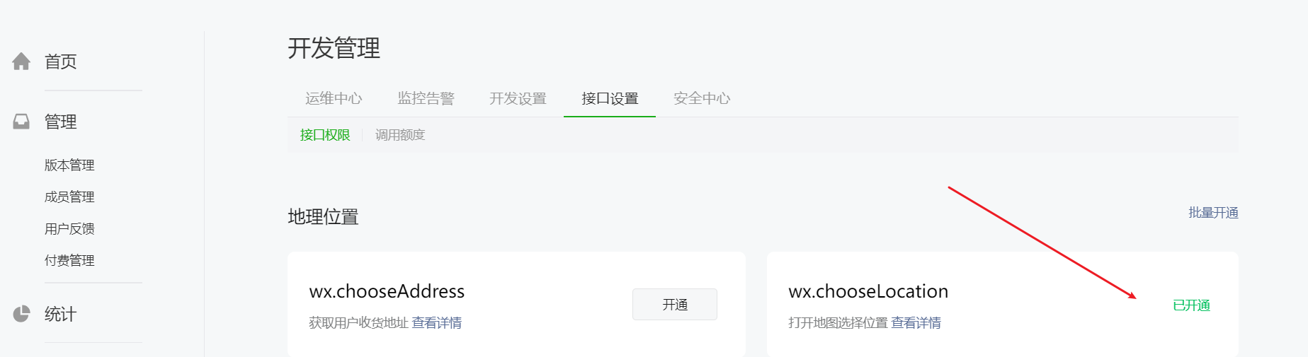 (2)如果上线微信小程序,还要记得去微信公众平台申请开通地图选择位置wx.chooseLocation(具体位置在侧边栏"开发"——>"开发管理"——>"接口设置")