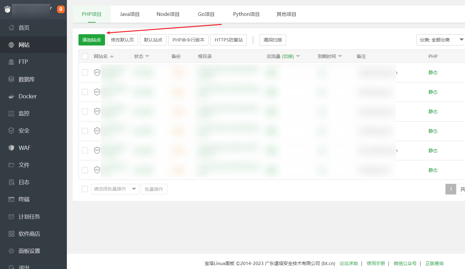 如上图所示,点击`添加站点`。注意:宝塔这里默认的分区是`PHP项目`,虽然我们的是Java项目,这里为了操作部署便捷,我们直接在默认的`PHP项目`栏目下进行添加站点操作。