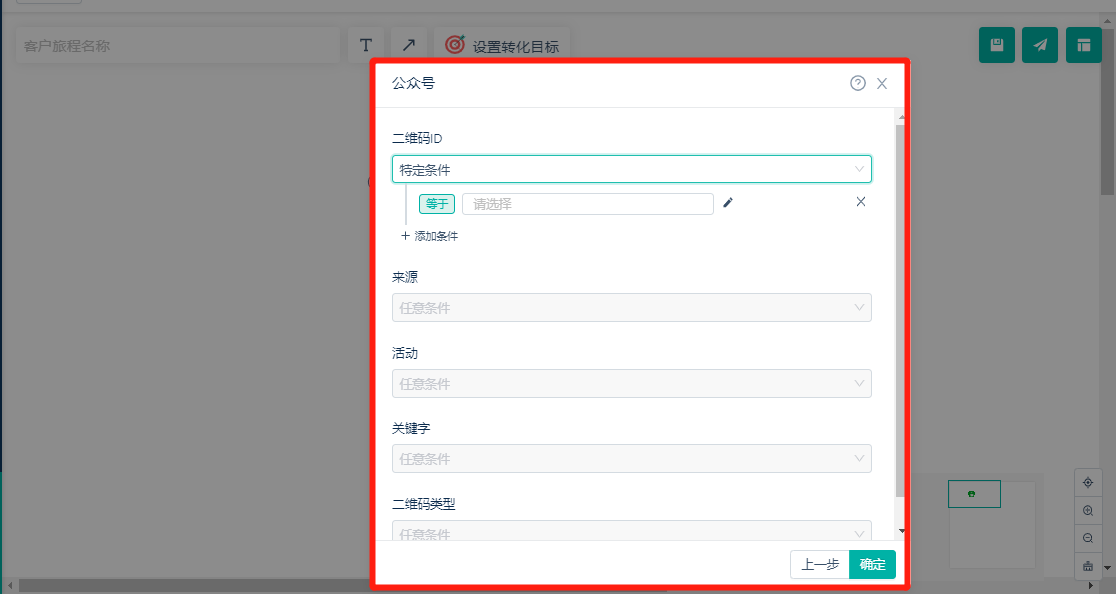 * **【扫描二维码】事件配置**:您可以根据限定二维码的参数“来源”、“营销活动”、“备注名”和“种类”筛选出指定二维码,也可以直接指定二维码ID定位一个二维码(此种情况,您就不可以再对“来源”、“营销活动”、“备注名”和“种类”进行设置了)。当然,您也可以不做参数的限制直接确定,视为扫描任一二维码的联系人即进入该客户旅程: