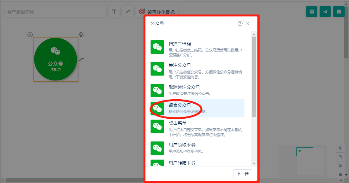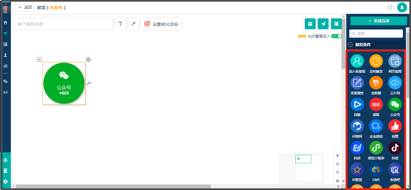 * 将【微信触发条件】拖入白板中进行下一步配置,支持多个不同的微信事件触发旅程: