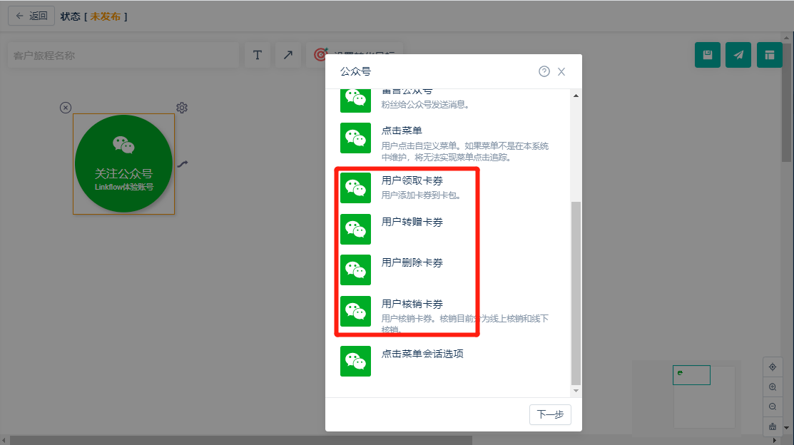 * **【卡券】事件配置**:微信卡券支持记录用户领取、转增、删除和核销卡券的相关事件。