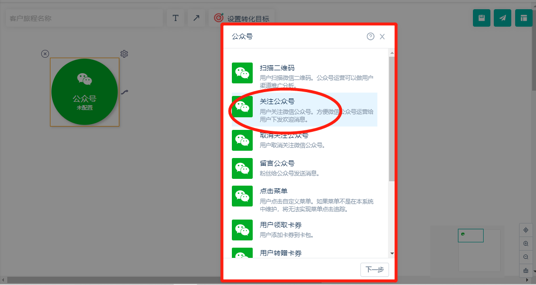 * **“【关注公众号】与“取消关注公众号”事件配置**:选择相关的公众号即可: