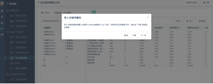 1、导入关键词与对应属性(点击页面右上角的导入按钮,若无模板,请先点击弹窗中的下载按钮,若已有模板,则点击弹窗中的下一步按钮)