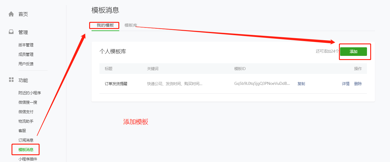 1. [登录微信小程序后台,没有申请模板消息的点击申请模板消息,申请的直接点击添加,微信规定模板最多添加25个]