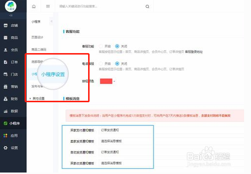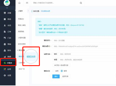 3. 假设您有一个商城,那么点击进入商城后台,点击小程序→其他设置→模板消息→添加模板,自定义设置模板发送的消息内容