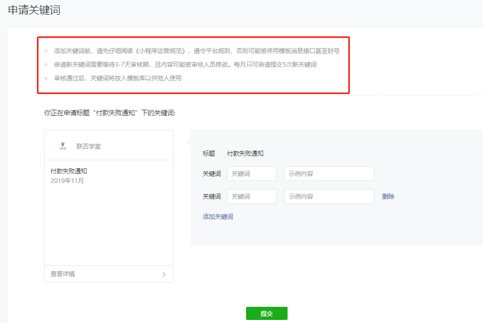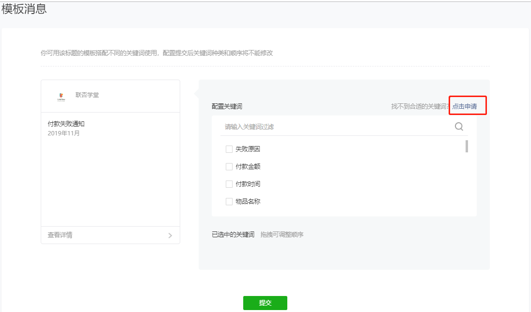 如果此模板消息的关键词不合适,需要申请关键词,可以点击申请,但是需要腾讯审核通过才能使用,一般需要7-15天的审核时间。