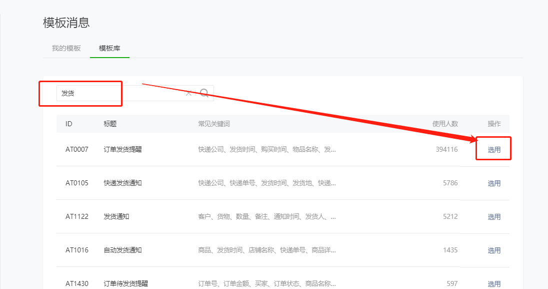 2. 输入支付、发货、收货,进行搜索选用需要的模板消息,微信小程序后台的模板消息会提供多个关于支付、发货、收货的模板消息